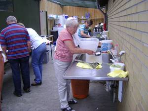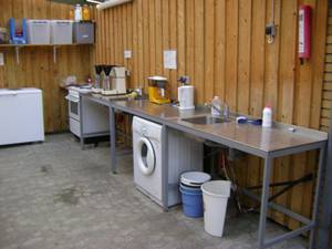 Der er et flot overdækket køkken, hvor der også er meget gode forholde til at vaske op. Mange som laver mad og spiser i campingvognen benytter køkkenet til opvask.